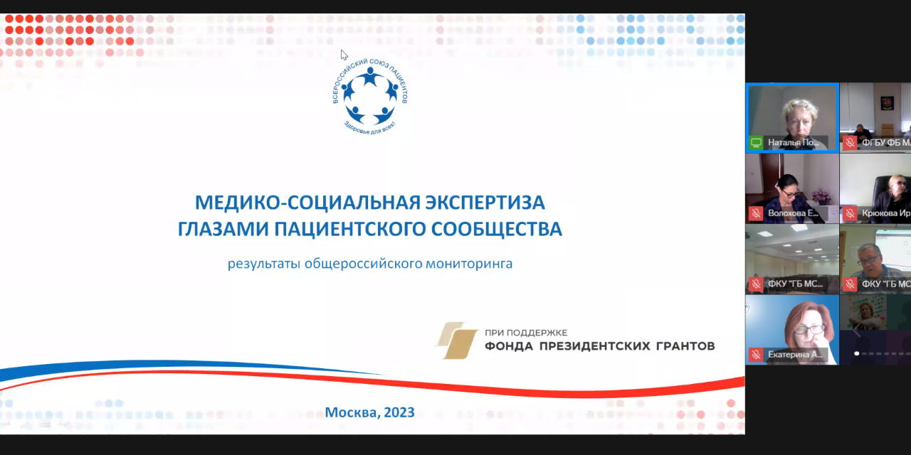 Всероссийский союз пациентов совместно с Общественной комиссией ФБ МСЭ 5.10.2023 провели Круглый стол по обсуждению итогов исследования «Медико-социальная экспертиза глазами пациентского сообщества». В работе принимали участие 56 представителей ОК ГБ МСЭ и сотрудники ГБ МСЭ регионов из 37 регионов.