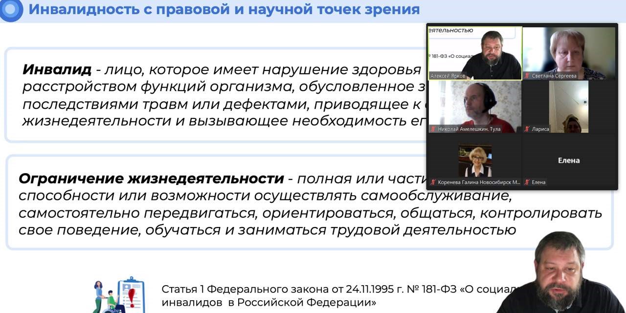 Ведущий вебинара Ярков А.А. – заместитель руководителя Федерального центра научно методического и методологического сопровождения развития системы комплексной реабилитации и абилитации инвалидов и детей инвалидов представил информацию о современном понимании инвалидности с правовой и научной точек зрения, медико-социальной экспертизе и международной классификации функционирования, ограничений жизнедеятельности и здоровья. На сегодняшний день, к большому сожалению, до сих пор многие граждане считают, что инвалидность присваивается на основании поставленного диагноза, НКО много работают над изменением представления в данном вопросе, но искоренить неверное представление окончательно, пока не удалось.