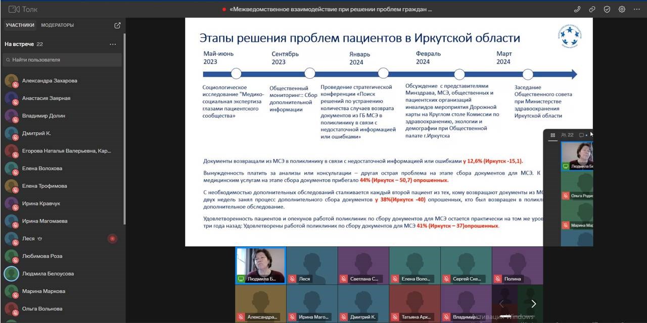 На круглом столе был представлен опыт двух регионов, которые представляли эксперты мероприятия - Белоусова Л.В., председатель ОК ГБ МСЭ Иркутской области и Хабаркова С.А., член Общественной палаты РФ от Республики Бурятия. Они поделились наработками взаимодействия с органами власти для решения наиболее острых вопросов при прохождении процедуры признания лица инвалидом.