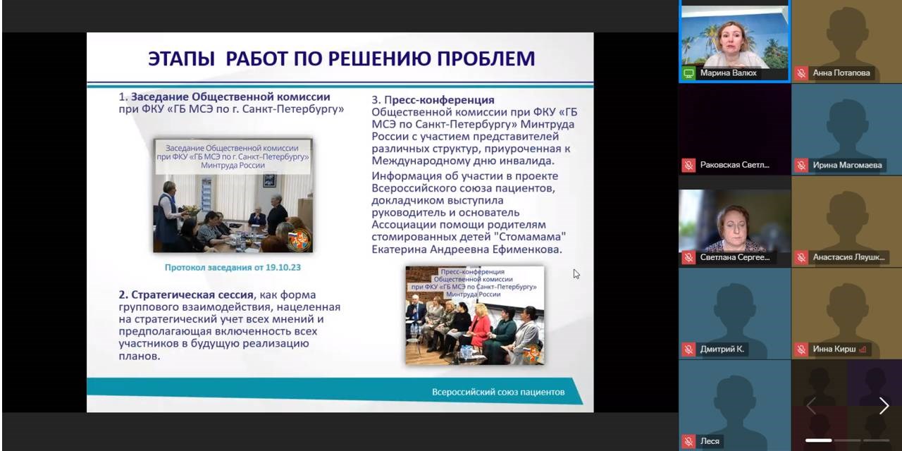 Валюх Марина, член Общественной комиссии ГБ МСЭ г. Санкт-Петербург, Президент Санкт-Петербургской региональной общественной организации инвалидов-больных рассеянным склерозом «Опора-М», представила результаты проводимой деятельности по теме: «Ускорение процесса подготовки пациентов к освидетельствованию на МСЭ на примере г. Санкт-Петербург». Были представлены модели 114 и 74 поликлиники «Маршрутизации пациентов при подготовке направления для освидетельствования в бюро МСЭ», которые позволяют ускорить и упростить процесс маршрутизации для пациента.