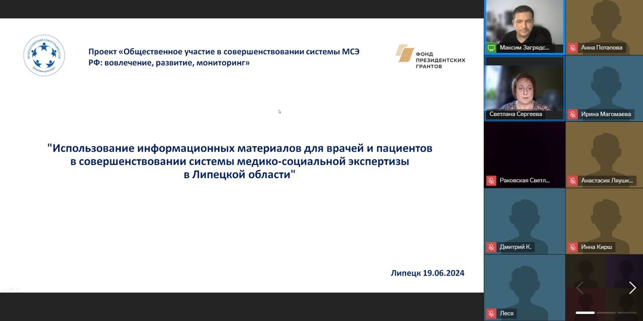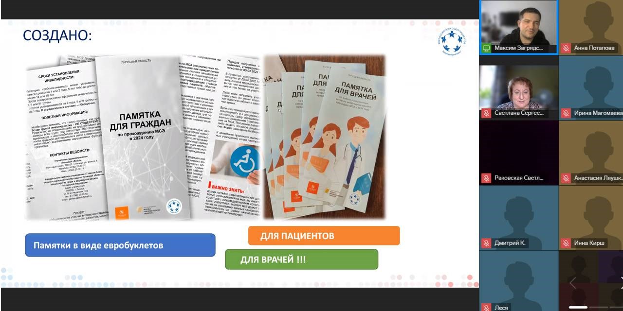 На круглом столе Загрядский Максим, Президент Фонда «Особая забота» представил опыт работы по теме - «Использование информационных материалов для врачей и пациентов в совершенствовании системы медико-социальной экспертизы в Липецкой области». Максим представил технологию решения проблемы, рассказал о реализованных шагах, предложил к распространению подготовленные буклеты «Памятка для граждан по прохождению МСЭ в 2024 году», «Памятка для врачей» и видео записи по данным темам.