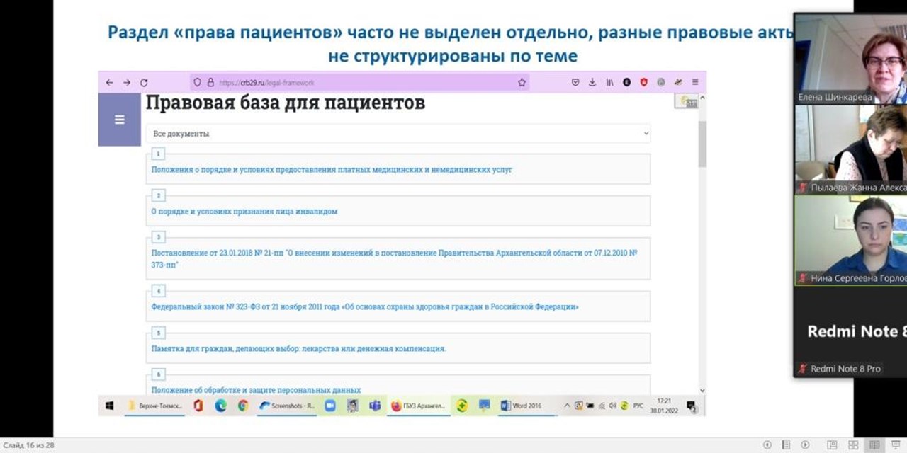 Также были представлены результаты мониторинга удаленных сервисов поликлиник - возможности записи к врачу по телефону, через сайт медорганизации, порталы Здрав29 и Госуслуги. Контрольные звонки общественников проведены в шести поликлиниках Архангельска, Северодвинска и Новодвинска. В основном, информация по телефону была представлена полно и верно, но беспокоит, что в ряде поликлиник есть трудность с записью к врачам, удаленная запись не для всех пациентов доступна (особенно для пожилых и некоторых групп людей с инвалидностью записаться через портал и Госуслуги очень сложно). В то же время, услуги записи по телефону не существует. Особенно она необходима пожилым людям и людям с инвалидностью.