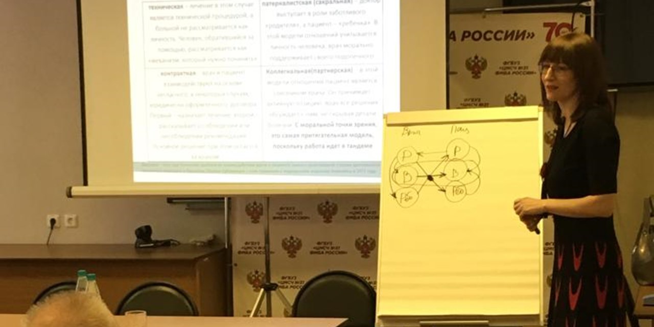 В ходе изучения модели пациент-ориентированной модели медицинской консультации и интерактивного изучения навыков эффективного взаимодействия врача и пациента ведущей Песневой О.В. отмечено, что 90% конфликтов возникает из-за неумения или нежелания врача объяснить пациенту или его близким информацию о состоянии здоровья, его права и обязанности.