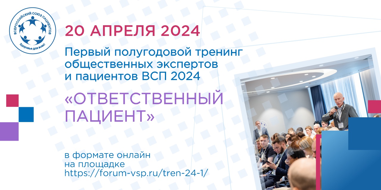 Всероссийский тренинг ВСП «Ответственный пациент» проводится 20 апреля 2024 года, в онлайн формате на площадке https://forum-vsp.ru/tren-24-1/
