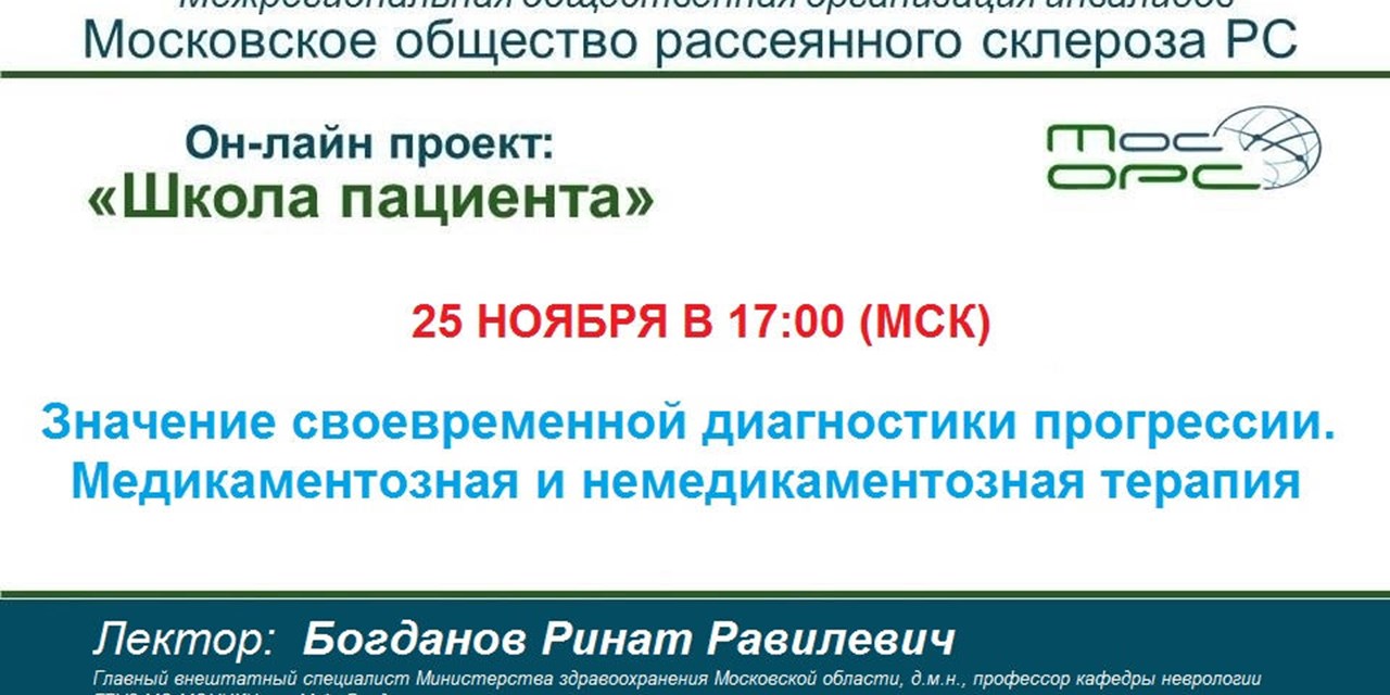 Друзья! Рады сообщить Вам, что 25 ноября 2020 года в 17:00, в рамках Online-проекта «Школа пациента» состоится интерактивный вебинар, в рамках которого мы подробно разберем две важные темы: «Значение своевременной диагностики прогрессии» и «Медикаментозная и немедикаментозная терапия»