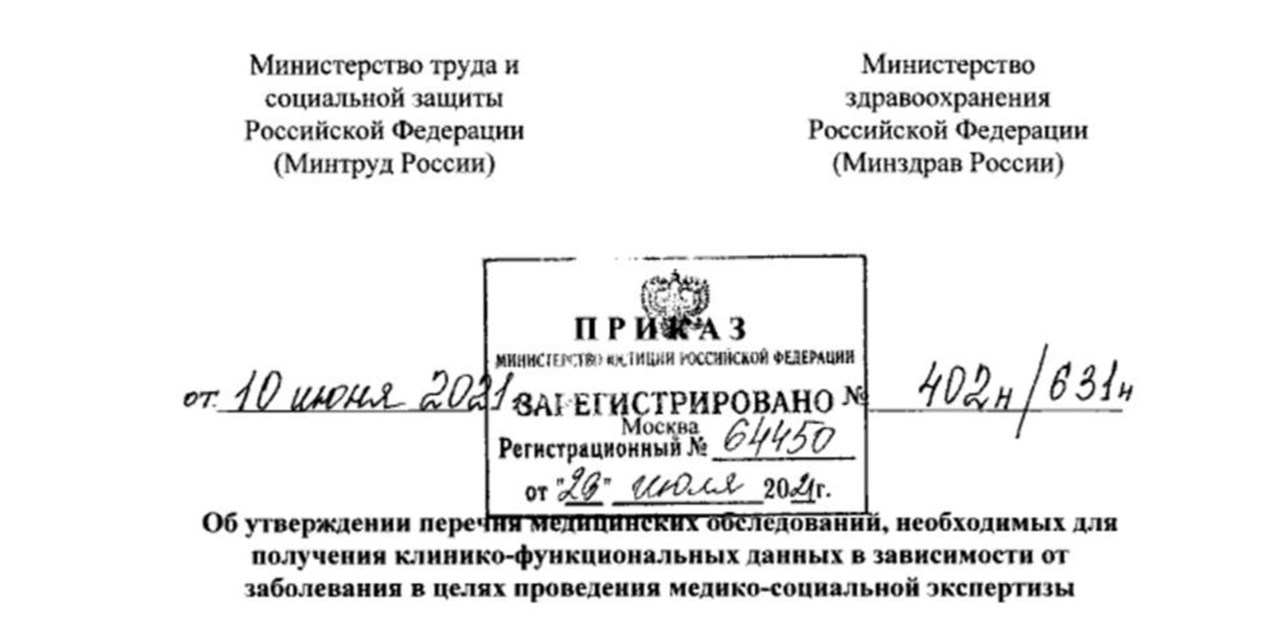 Для получения необходимых клинико-функциональных данных в целях проведения медико-социальной экспертизы гражданин проходит медицинские обследования, перечень которых утвержден совместным приказом №631Н Минтруда и № 402Н Минздрава России 10 июня 2021 года. Обязательные обследования и исследования: МРТ головного и спинного мозга с контрастированием, прием (осмотр) врача-невролога, прием врача-психолога, измерение роста и веса, кардиограмма, общий анализ мочи, клинический анализ крови, анализ крови биохимический.