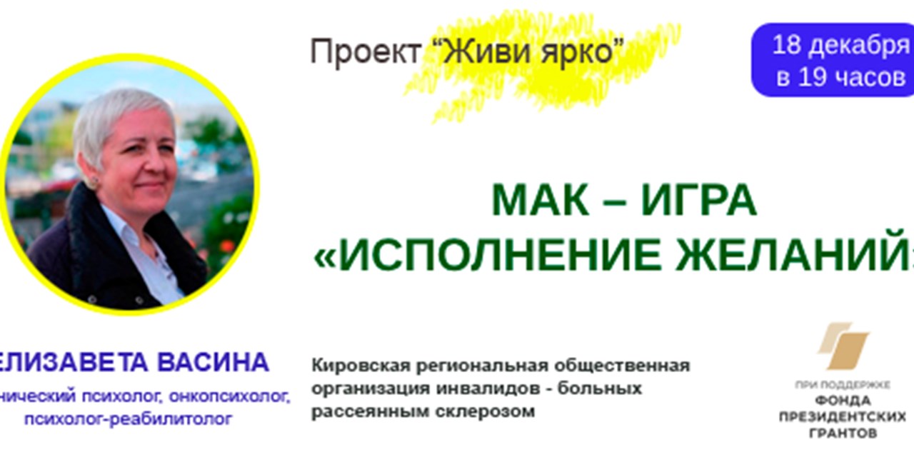 Психологический онлайн тренинг проводится в рамках реализации проекта «Живи ярко: комплексная реабилитация больных рассеянным склерозом», реализуемого Кировской региональной общественной организацией инвалидов – больных рассеянным склерозом на средства гранта, предоставленные Фондом президентских грантов.