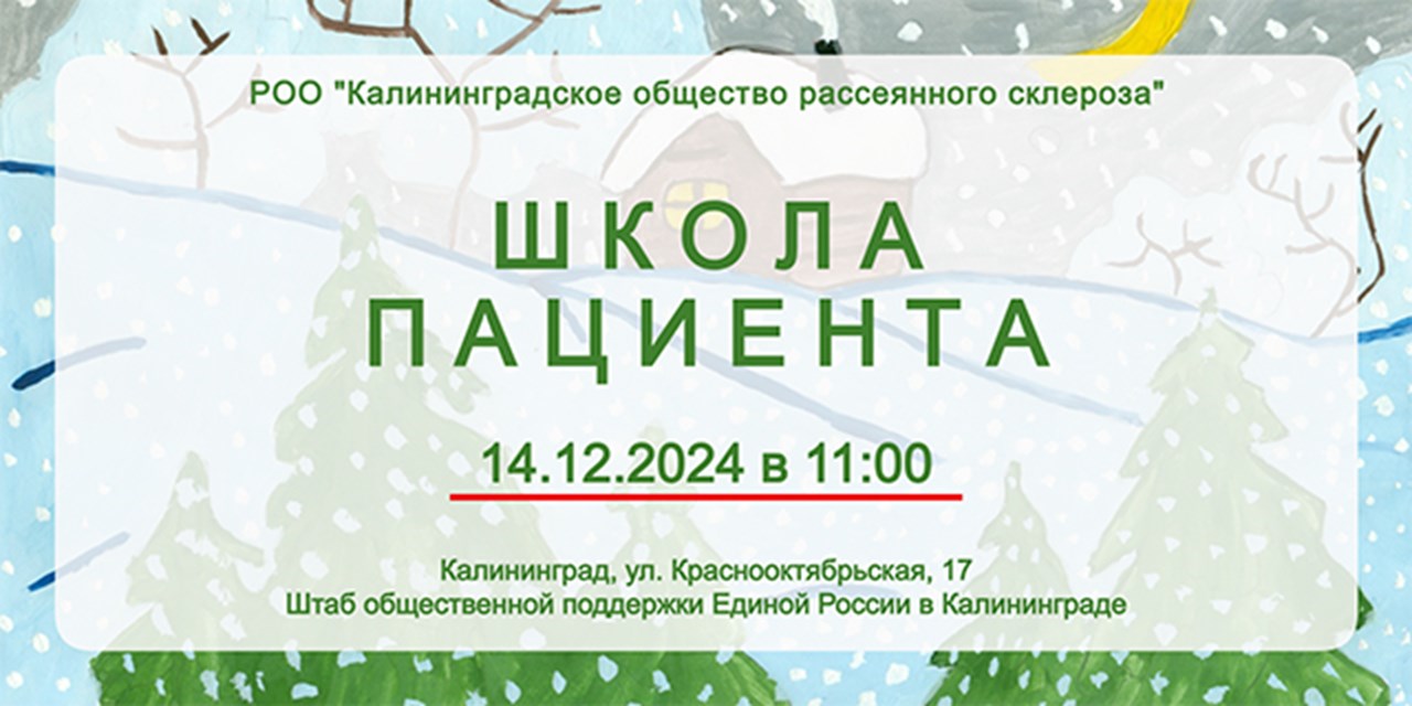 В субботу 14 декабря 2024 в 11 часов приглашаем пациентов с рассеянным склерозом, их родственников, а также всех заинтересованных лиц на школу пациента.
