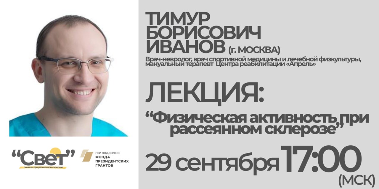 В понедельник, 29 сентября в 17:00 по Мск, выступит врач-невролог, врач спортивной медицины и лечебной физкультуры Тимур Иванов. Он не только поведает важные аспекты о методиках реабилитации при рассеянном склерозе, но и ответит на ваши вопросы.