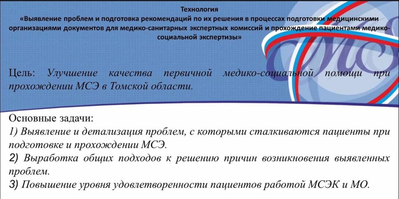 В рамках проекта Общероссийской общественной организации инвалидов – больных рассеянным склерозом «Сибирь и Дальний Восток – активизируем пациентское сообщество», реализуемого при поддержке Фонда президентских грантов, Советом общественных организаций по защите прав пациентов при Территориальном органе Федеральной службы по надзору в сфере здравоохранения по Томской области была разработана социально значимая технология «Выявление проблем и подготовка рекомендаций по их решению в процессах подготовки медицинскими организациями документов для медико-санитарных экспертных комиссий и прохождение пациентами медико-социальной экспертизы».