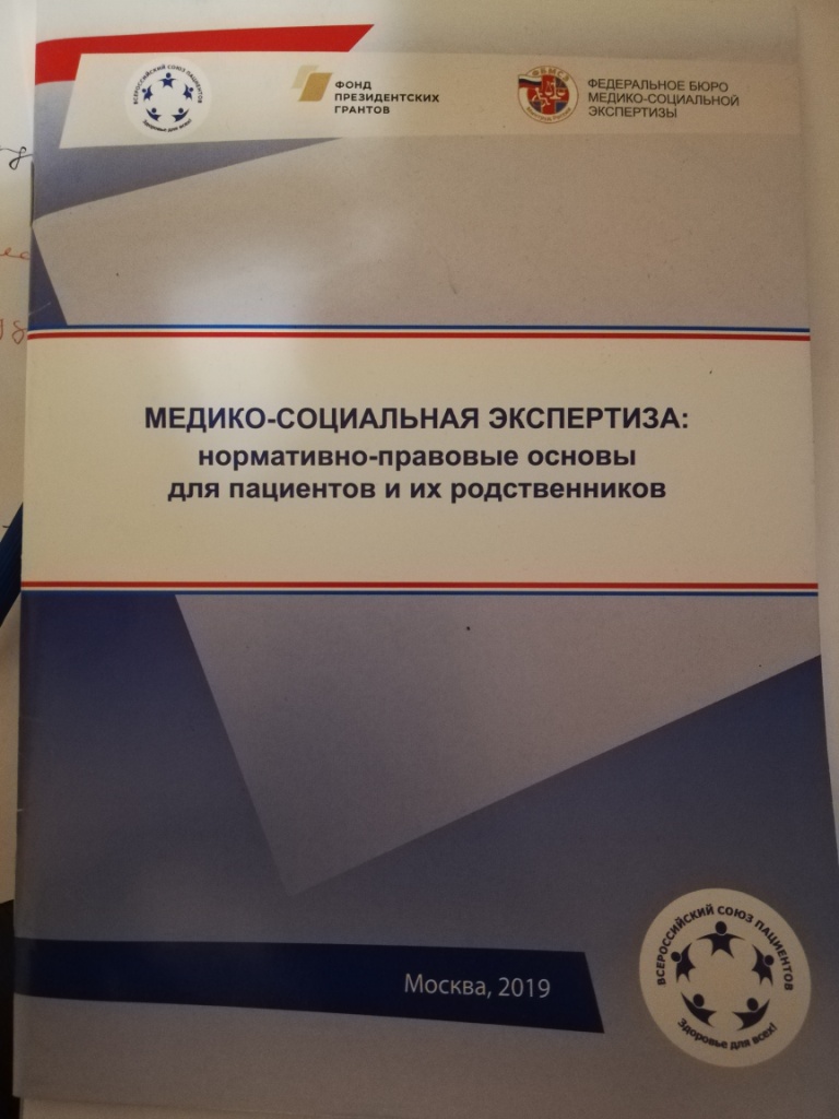 Всем участникам были разданы методические материалы «МЕДИКО-СОЦИАЛЬНАЯ ЭКСПЕРТИЗА: нормативно-правовые основы для пациентов и их родственников».