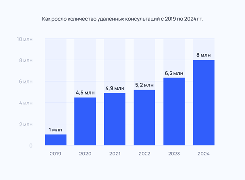 Хотя пандемия официально закончилась 5 мая 2023 года, когда ВОЗ объявила об окончании чрезвычайной ситуации, телемедицина прочно закрепилась в жизни россиян. Сейчас ежегодно проводят больше 8 миллионов дистанционных консультаций.