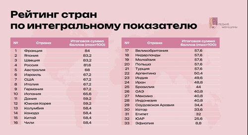 В итоге в рейтинге из 33 стран Россия оказалась на четвертом месте, но можно также говорить о том, что она — в числе четырех безоговорочных лидеров. У Франции — 84 балла, у Японии и Швеции — по 83,2 балла, у России — 81,6 балла. Австралия, которая находится на пятом месте, сильно отстает, набрав лишь 68 баллов.