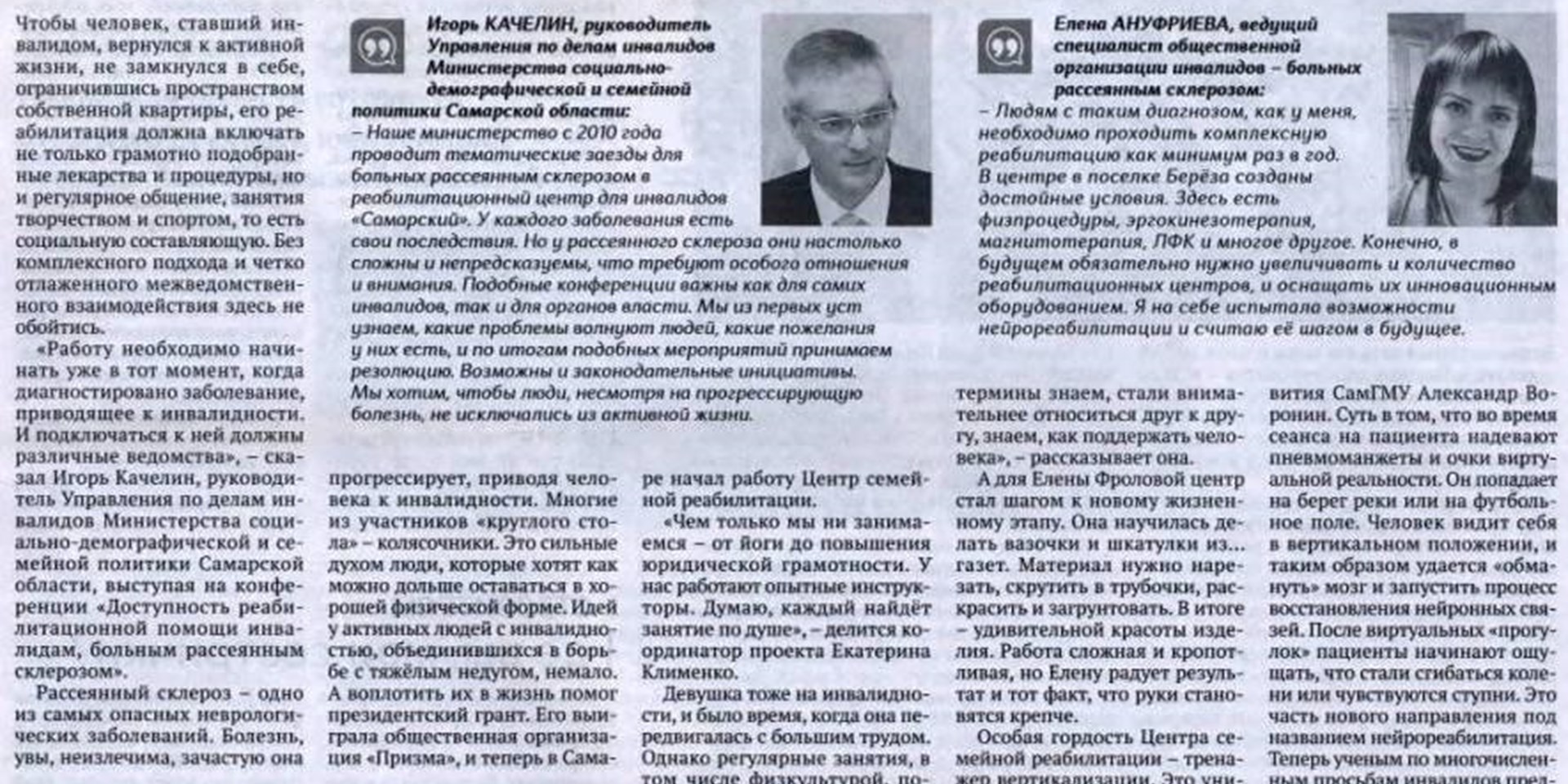 За счет средств грантов Президента Российской Федерации на развитие гражданского общества, предоставленного Фондом президентских грантов, Самарские организации рассеянного склероза продолжают реализацию социально значимых проектов «Технологии виртуальной реальности в медико-социальной реабилитации» и «PROдвижени к активной жизни. Центр социальной реабилитации людей с ограничениями в передвижении». Об этом, и многом другом шел разговор в студии ТРК Губерния.